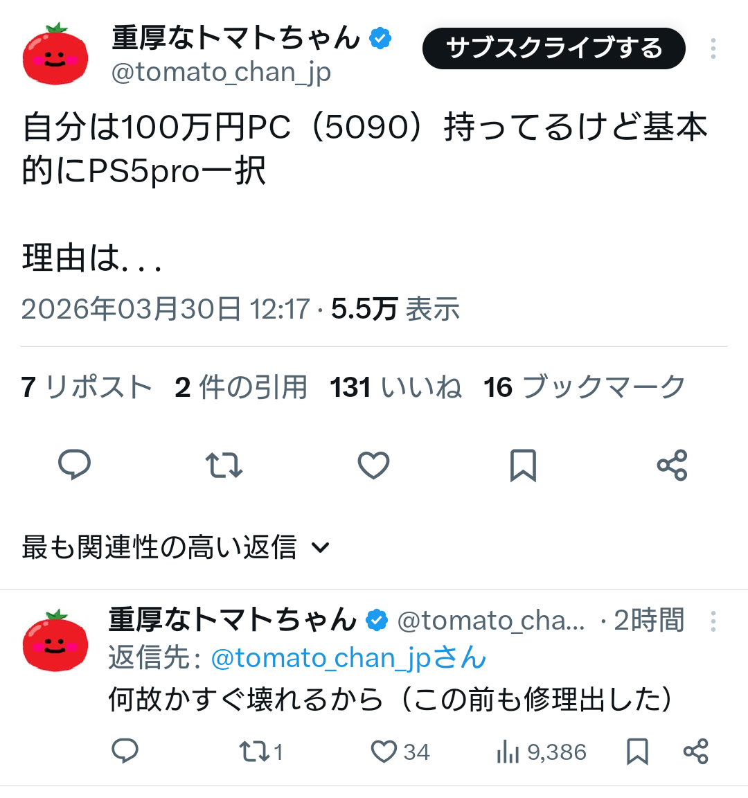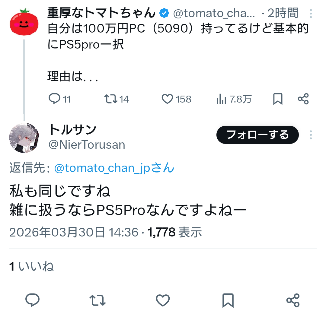 まぁ値段の差(12万と100万だからほぼ8倍か)ほどゲーム体験変わるかっつうと別にそんなことないし(仮に5090のPCが300fpsや400fpsでゲームできたとしてもそれを人間の能力で実感できるのか?)コスパの観点で見たら優れてるのはPS5Proの方って考えも普通にありえる