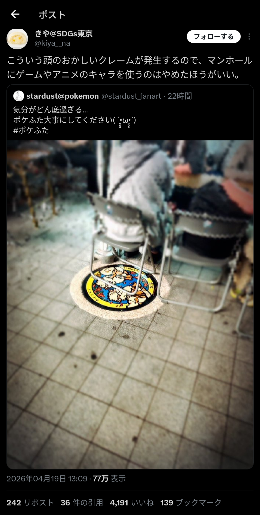 ポケふたは株式会社ポケモンが自治体に寄贈する形で設置されていて、観光資源・地域活性化を目的に作られてるからファンの過剰だ!っていうのもおかしい話ではあるけどね。