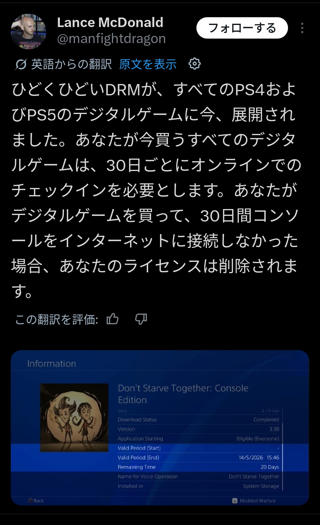 「30日間ネットに繋がないと購入したゲームのライセンスが消滅します」