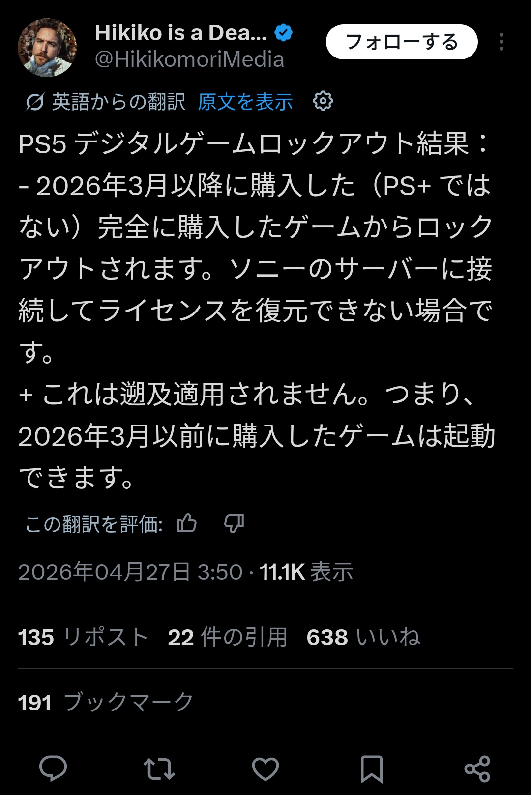今回の件、強制切断と再開時訴訟対策規約同意強制、30日オンに繋げなかったらDL版権利消失がほぼ同時ってのが答えだな